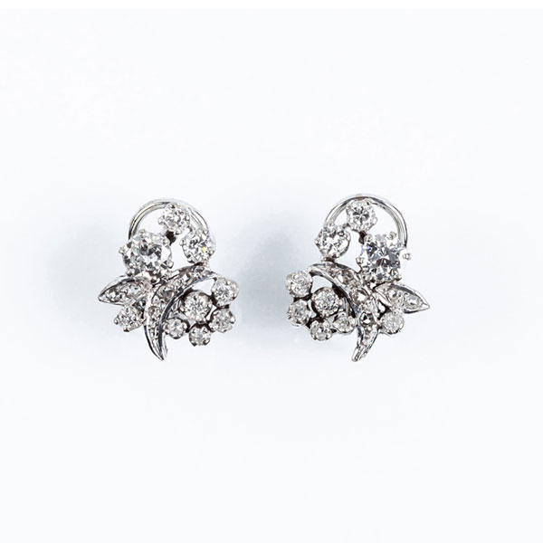 Bellos pendientes vintage en oro blanco, diseño vegetal calado, con un diamante, talla brillante, central y cuajados de diamantes talla brillante, en garras, y bandas de diamantes.