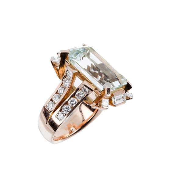 Sortija en sólida montura de oro rosa, con gran aguamarina central, talla esmeralda, en garras flanqueada de limpios y blancos diamantes talla baguette y princesa, con doble brazo decorado en bandas de limpios y blancos diamantes talla brillante, en carril.
