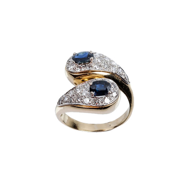 Sortija bilabial en oro amarillo, con zafiros finos azules, talla oval, en garras, sobre lengua en pavé de blancos diamantes talla 8/8, al final de cada brazo.