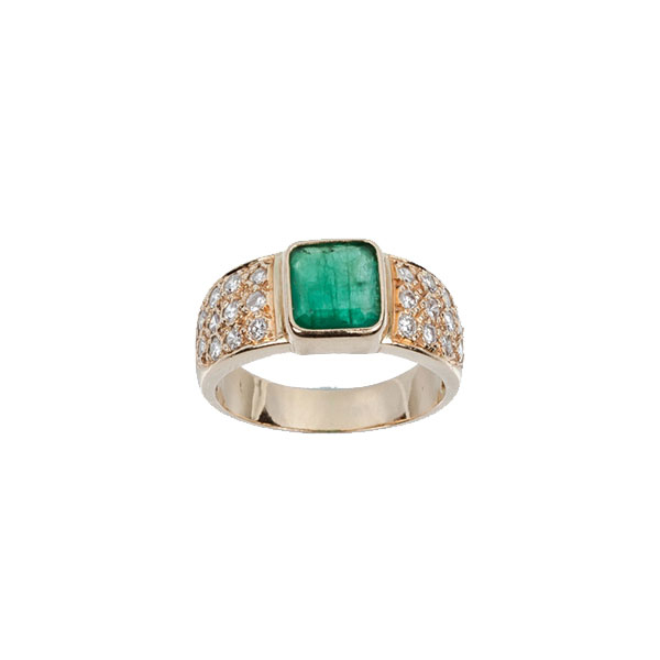 Sortija en oro amarillo con esmeralda en su talla, sobre banda en pavé de limpios y blancos diamantes, talla brillante.