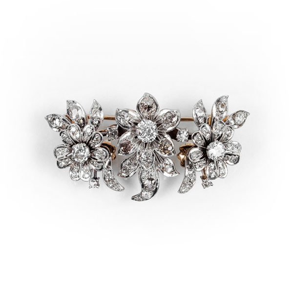Delicado broche-alfiler altiguo en oro bicolor, formado por tres flores cuajadas de diamantes con centros talla brillante antigua. Las dos flores laterales, son desmontables.