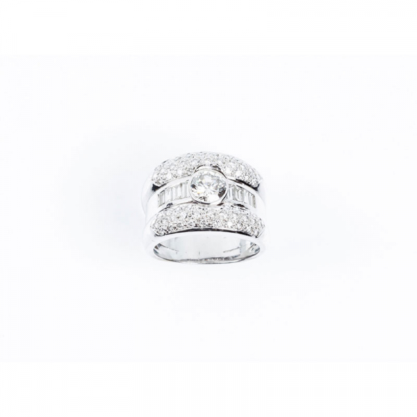 (características estimadas: color G-H, pureza VVS, sin fluor.), en chatón, sobre banda de diamantes baguettes, entre motivos 'bombé ' en pavé de diamantitos talla brillante. Peso 8 bag: 0.50 ct y 60 btes: 0.70 ct aprox. Nº anillero: 12.