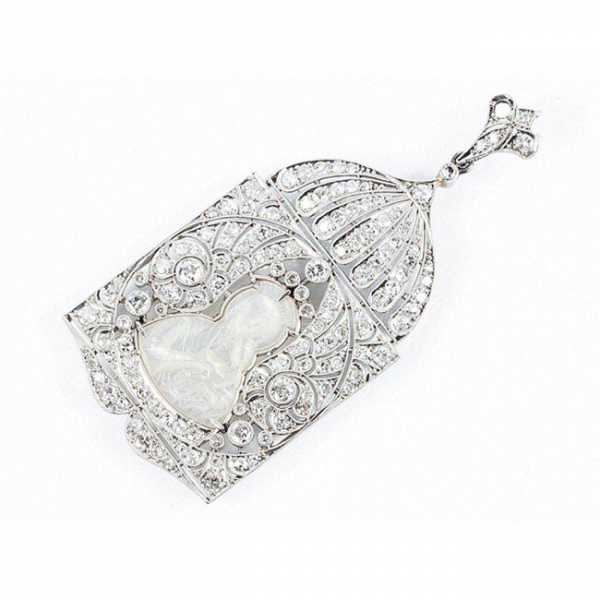 Bello colgante modernista en 'capilla' calada de platino u oro blanco, cuajado de limpios y blancos diamantes y brillantes talla antigua, en decoración grafilada, con relieve central de Virgen con Niño en nácar (122 dts 8/8: 2.10 ct y 5 bts: 0.35 ct aprox.