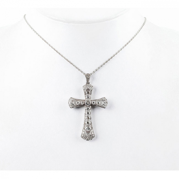 Cadenita con bella cruz colgante modernista en platino, cuajada de blancos diamantes 8/8 y centro con brillantes talla antigua, en decoración calada y grafilada