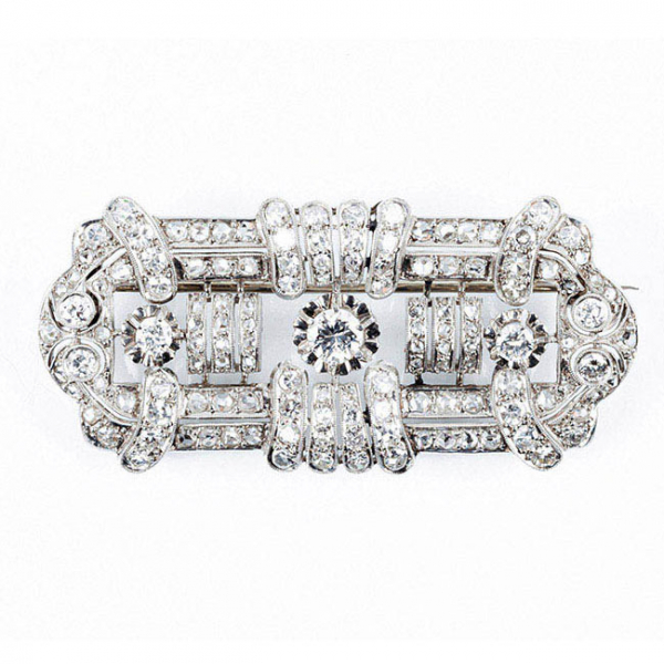 Placa-alfiler 'decó' en platino u oro blanco, con motivo geométrico calado, cuajado de limpios y blancos diamantitos en vistas grafiladas,