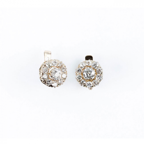 Pendientes rosetón antiguos en oro amarillo con un bonito diamante, talla brillante antigua, central, elevado, orlado en fila de brillantitos, en garras