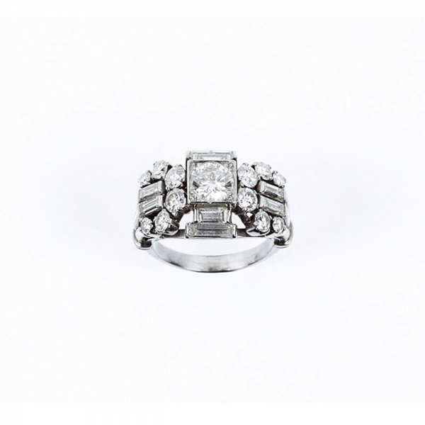 Sortija vintage en montura de platino con un limpio y blanco diamante, talla brillante central flanqueado por motivos geométricos de limpios y blancos diamantes, talla brillante y baguette