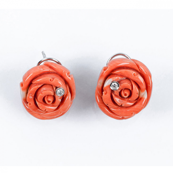 Bellos pendientes en oro blanco, con una gran rosa tallada en coral rojo, decorada con un limpio y blanco diamante talla brillante, en chatón grafilado. 2 btes: 0.16 ct aprox