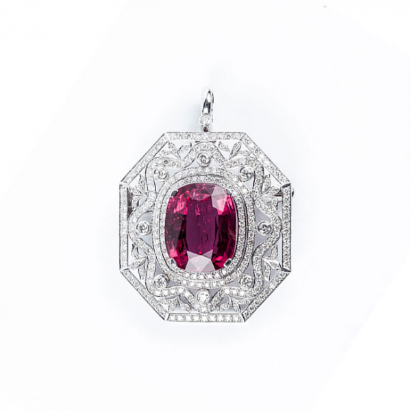 Gran alfiler-colgante de alta joyería, en oro blanco, con una bella turmalina rosa central, talla oval, enmarcada en motivo octogonal calado, cuajado en bandas de limpios y blancos diamantes, talla brillante (Pesos y características estimadas: 244 bts: 5.30 ct, 9 bts: 0.60 ct Color H, pureza VS.