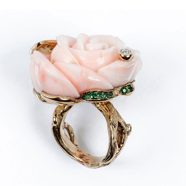 Gran sortija de alta joyería, en sólida montura de oro amarillo con una rosa tallada en coral piel de ángel, sobre brazo en formas vegetales, hojitas en pavé de tsavoritas y un limpio y blanco diamante, talla brillante (1 bte: 0.15 ct aprox,. Características estimadas: color I, pureza VS). Nº de anillero: 11-12.