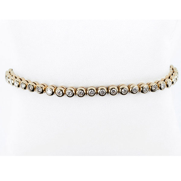 Pulsera riviere en sólida montura de oro amarillo con limpios y blancos diamantes, talla brillante, en chatones articulados (45 bts: 2.50 ct aprox.