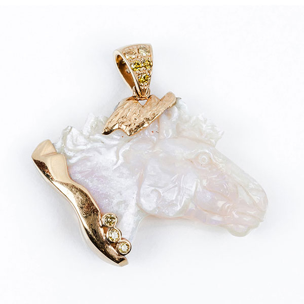 Original colgante, 'cabeza de caballo' tallada en ópalo blanco iridiscente, en sólida montura de oro amarillo,