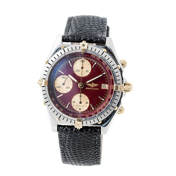 Esfera granate con tres contadores dorados, agujas y baquetones luminiscentes. Calendario a las 3. Brazalete de piel (a estrenar), con hebilla original. Muy buena condición (1-2). Estado de marcha.