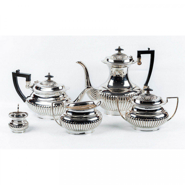 Juego de café en plata de ley contrastada, estilo 'decó', con cuerpos gallonados y asas geométricas, junto con detalles en la tapa, en madera lacada en negro.