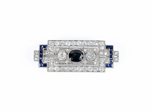 Alfiler de época 'art-decó' en oro blanco o platino, diseño rectangular calado, con centro de zafiro azul, oval (1.50 ct aprox), entre dos blancos diamantes talla 'cushion' antigua, en chatón, sobre motivo geométrico en filas de diamantes y zafiros calibrados.