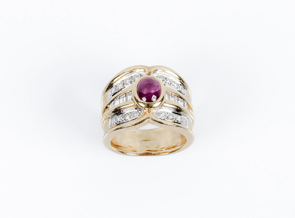 Sortija ancha en sólida montura de oro amarillo con centro en cabujón de rubí oval, en chatón, sobre bandas de limpios y blancos diamantes y talla brillante