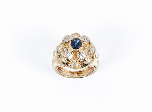 Sortija maciza en oro amarillo con un bonito zafiro azul oval, en chatón abierto, sobre orla bailarina en pavé de limpios y blancos diamantes talla brillante, alternada con motivos en banda de trapecios