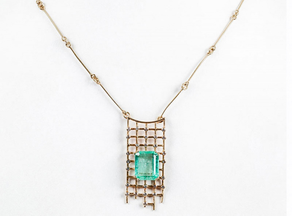 Cadena de barritas y colgante con una bella esmeralda de gran calidad y transparencia (12,5 x 10,4 x 7,5 mm) montada en rejilla de oro rosa salteada de limpios y blancos diamantitos, talla brillante