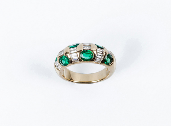 Sortija de alta joyería en sólida montura de oro amarillo, con frente curvo, decorado con bellas esmeraldas talla oval y bandas de diamantes baguette. 6 esm: 1.60 ct y 16 dtes: 1.00 ct aprox