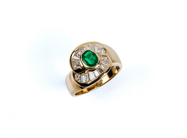 Sortija en oro amarillo con banda ancha de limpios y blancos diamantes, con un diamante talla esmeralda, central, flanqueado de de diamantes baguette