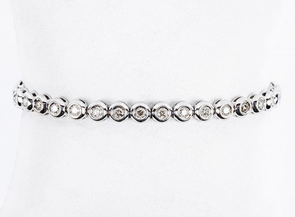 Pulsera tipo "rivière" en oro blanco con frente en fila de limpios diamantes talla brillante, en chatón