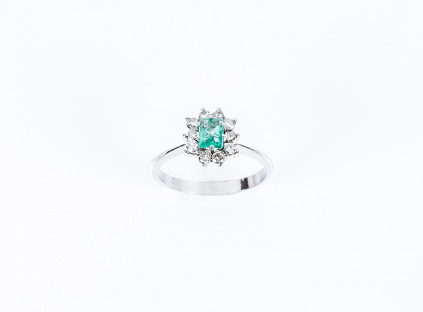 Sortija en oro blanco con bonita esmeralda colombiana, en su talla, y orla en fila de limpios y blancos diamantes talla 8/8, en garras.