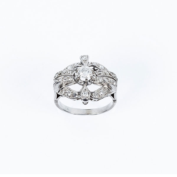 Bella sortija de época 'art-decó', en platino, con un blanco diamante central, talla brillante, en garras de ilusión, sobre motivo geométrico calado cuajado de diamantes talla antigua y 8/8 sobre vistas grafiladas