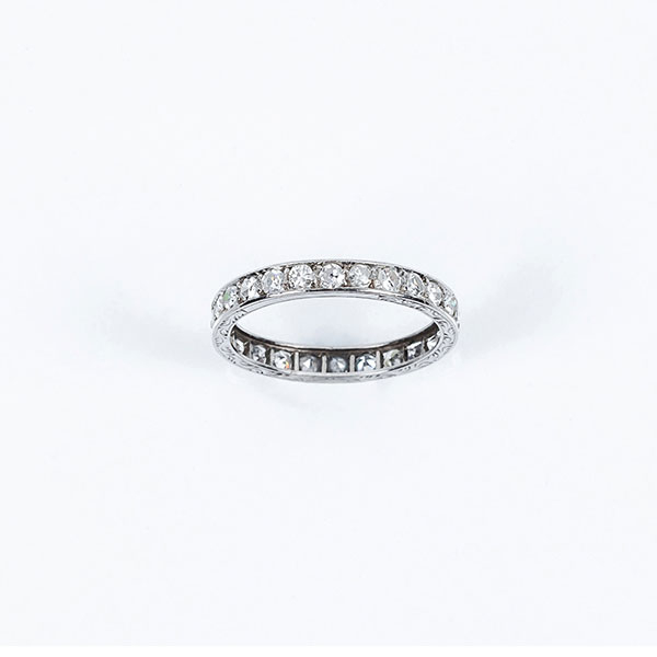 Alianza completa vintage en oro blanco y fila de limpios y blancos diamantes talla 8/8, con guirnalda vegetal grabada en los laterales