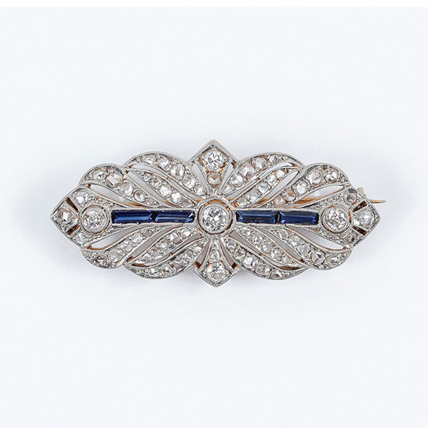 Bonito alfiler vintage, estilo Decó, en montura calada de oro rosa con vistas grafiladas de platino u oro blanco, cuajado de blancos diamantes.