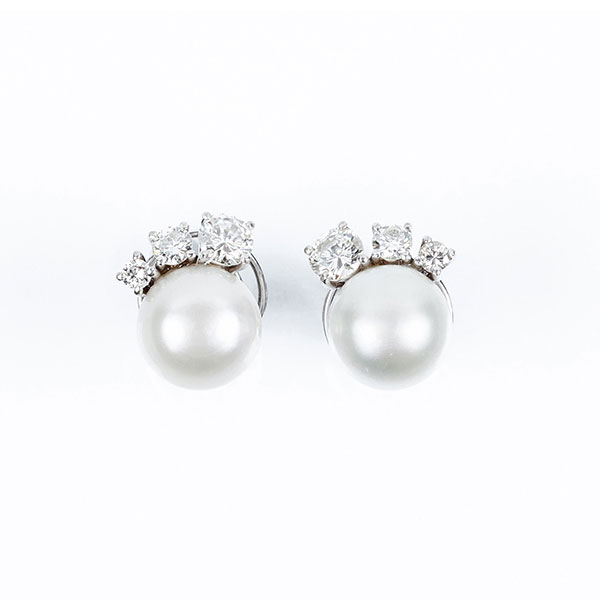 Pendientes vintage en oro blanco con una perla australiana, ligeramente abotonada (11 mm) y motivo de tres limpios y blancos diamantes, talla brillante, en disminución.