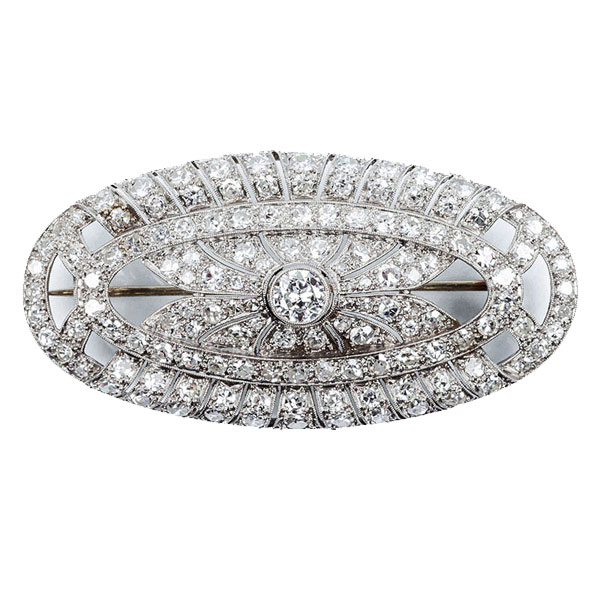 Bello broche antiguo 'art-decó' en montura oval de oro blanco, con un blanco diamante central, talla brillante, sobre bandas caladas, curvas y ondulantes, y orlas cuajada de diamantes 8/8, en vistas grafiladas