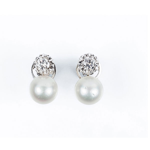 Pendientes vintage 'tú y yo' en oro blanco, con una perla austrliana de 12 mm., coronada por un limpio y blanco diamante talla brillante, en garras de ilusión
