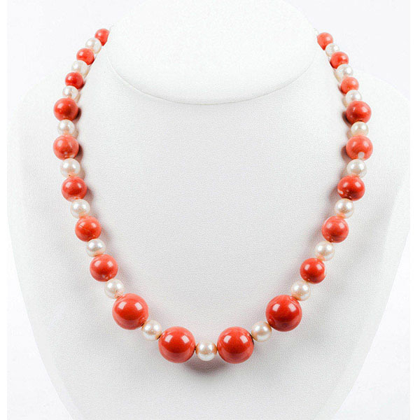 Collar vintage de perlas cultivadas japonesas alternadas con bellas cuentas de coral rojo natural, en disminución de 15.5 a 8.1mm (coral) y de 8.8 a 4.7 mm (perlas).