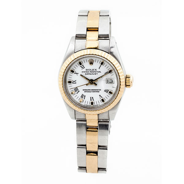 Reloj suizo, sra. ROLEX 'Oyster Perpetual DateJust' Ref: 15000. En caja, 25 mm, y brazalete 'President' de acero y oro. Movimiento automático. Esfera blanca con numerales romanos.