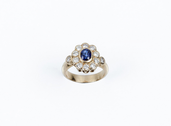 Sortija en oro amarillo con rosetón de zafiro oval y orla en fila de limpios y blancos diamantes talla brillante, en chatón.