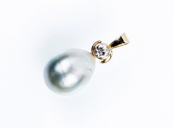 Colgante en oro amarillo con gran perla australiana en forma de pera, de bello oriente gris nacarado