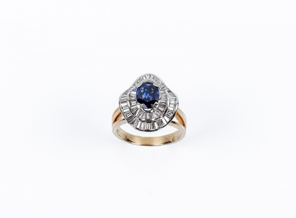 Sortija en sólida montura de oro amarillo con un bello zafiro fino azul, oval y doble orla bailarina en bandas de limpios y blancos diamantes baguette.