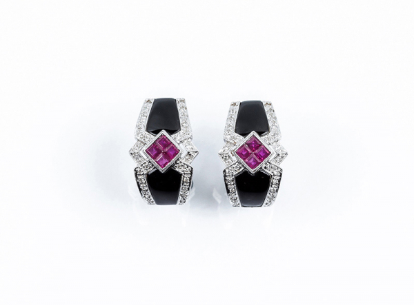 Pendientes medias criollas en oro blanco con centro en pavé de rubíes calibrados, en chatón, sobre placas de ónix orladas en bandas en fila de diamantes talla brillante