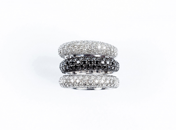 Conjunto de alta joyería formado por tres anillos en sólida montura de oro blanco, con frente en pavé de diamantes, talla brillante, blancos en dos de ellos y negros en el otro.