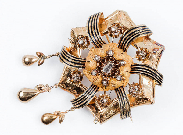 Alfiler antiguo, en rosetón calado de oro amarillo, pulido y matizado, con decoración esmaltada en negro y detalles grabados
