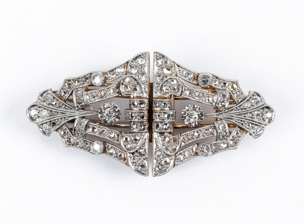 Alfiler antiguo, doble clip, en forma de rombo horizontal, desmontable, en sólida montura de oro rosa con vistas grafiladas de platino y bandas caladas cuajadas de blancos y limpios diamantes, talla simple y 8/8, con dos diamantes centrales talla antigua en garras de ilusión