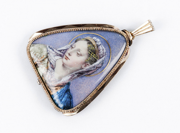 Medalla vintage en oro rosa con una delicada miniatura clásica de madonna con velo, en esmalte semitransparente, de forma triangular, con orla punteada y trasera en decoración modernista en relieve.
