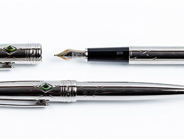 Cuerpo en plaqué-platino, con una turmalina talla 'sebo' en rombo en el capuchón, con la estrella Montblanc en nácar y número de serie individual grabado en el anillo del clip. Plumín de oro de 18 K. Sistema de carga por émbolo. 13,5 y 13,7 cm. Impecable condición (0).