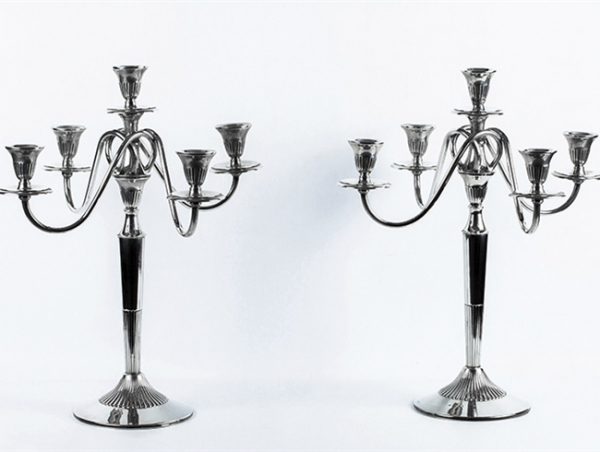 Pareja de bellos candelabros vintage, de cinco luces, en plata de ley, española (contraste estrella de 5 puntas) con base circular de copa decorada en gallones y contrapeso interior.