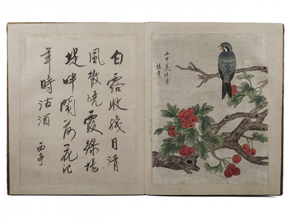 Cinco páginas dobles con ilustraciones de aves. Tapas forradas en seda (las tapas presentan algunas manchas de humedad). Principios S.XX.