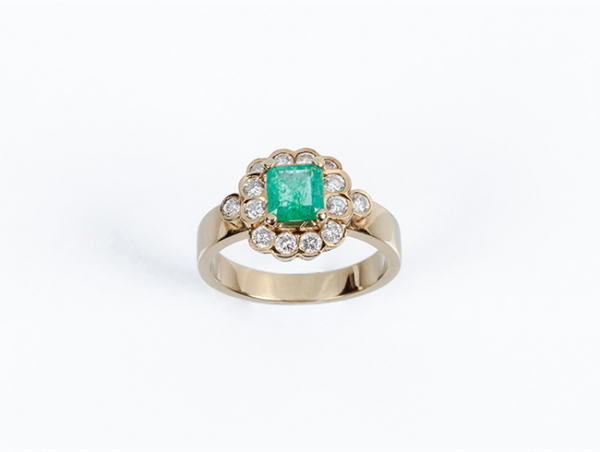 Sortija en oro amarillo, con una bonita esmeralda colombiana en su talla, y orla y hombros de limpios y blancos diamantes, talla brillante, a diferentes alturas