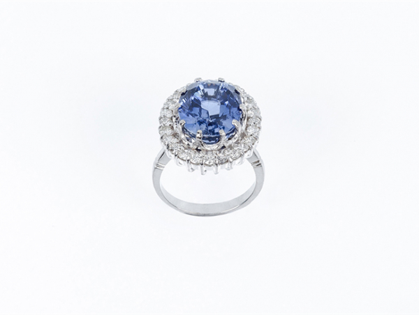 Bella sortija en oro blanco con gran zafiro azul oval, sintético, y orla calada, en fila de limpios y blancos diamantes talla brillante.