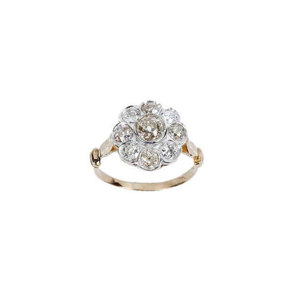 Anillo vintage en oro amarillo 18 K con motivo en rosetón de limpios diamantes talla brillante antigua sobre vistas grafiladas de oro blanco.