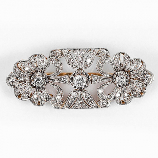 Bonito alfiler vintage en placa calada de diseño vegetal, en oro amarillo con vistas grafiladas de oro blanco y cuajado de limpios y blancos diamantes talla 8/8, con tres centros de diamante talla brillante, en garras de ilusión.