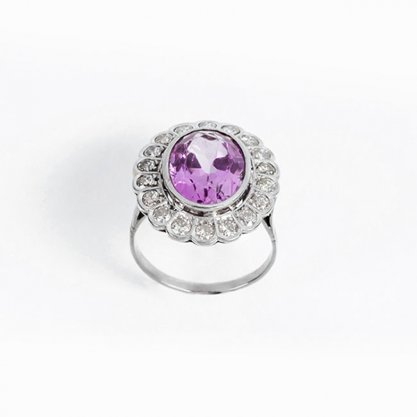 Bella sortija antigua en platino u oro blanco con piedra rosa oval orlada de limpios y blancos diamantes, talla brillante, en vistas grafiladas.